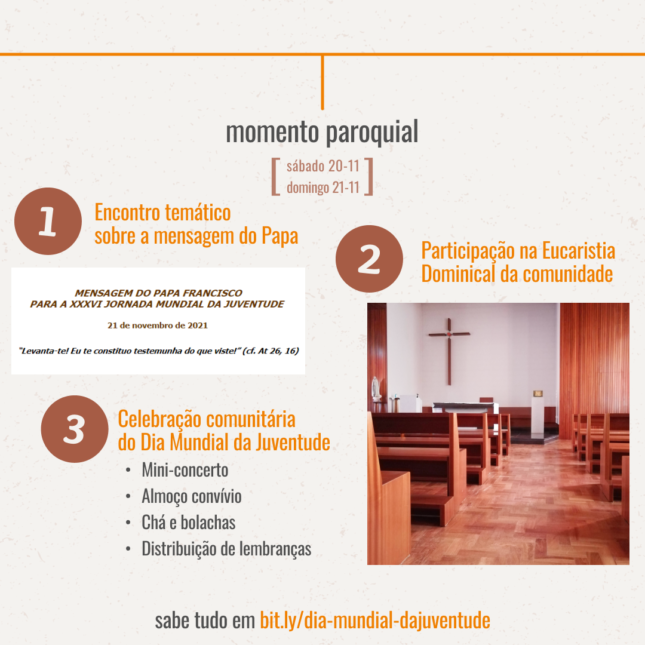 O momento paroquial prevê um encontro temático, para jovens, sobre a mensagem do Papa para este dia e a participação na Eucaristia dominical da comunidade, seguida de um momento de partilha e convívio paroquial: um mini-concerto, um almoço/lanche partilhado, a distribuição de lembranças, entre outras sugestões.