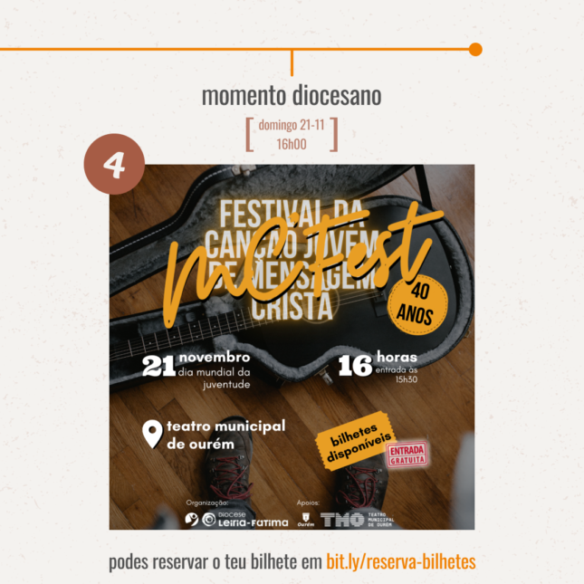 Como é importante celebrar não só nas comunidades paroquiais, mas também a nível diocesano, o SDPJ propõe que na tarde do Dia Mundial da Juventude, os jovens participem no Festival Diocesano da Canção Jovem de Mensagem Cristã (MC’Fest 2021) que vai decorrer no Teatro Municipal de Ourém, a partir das 16h00, desse dia 21 de novembro. Na celebração dos 40 anos deste Festival, estão preparados momentos que comemoram este marco importante para a pastoral juvenil diocesana.